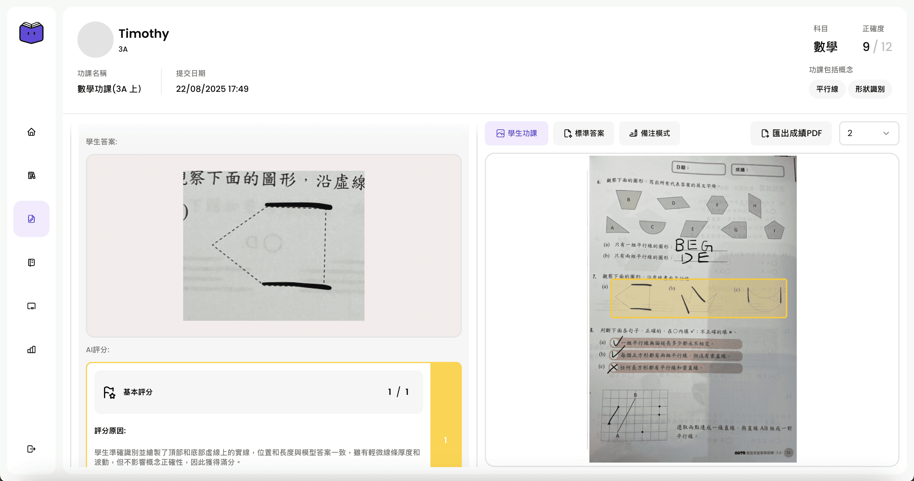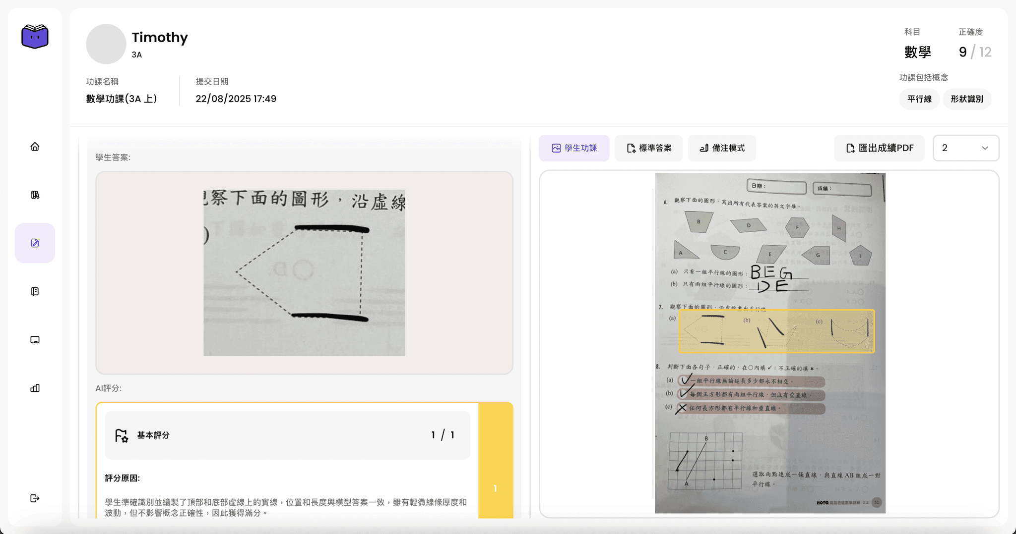 自動將紙本作業轉換為數位格式,一鍵自動完成批改及轉換,且不影響教師現有的工作流程。
